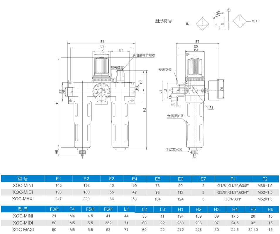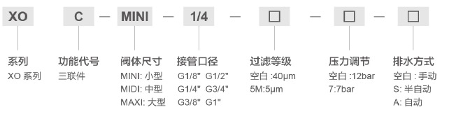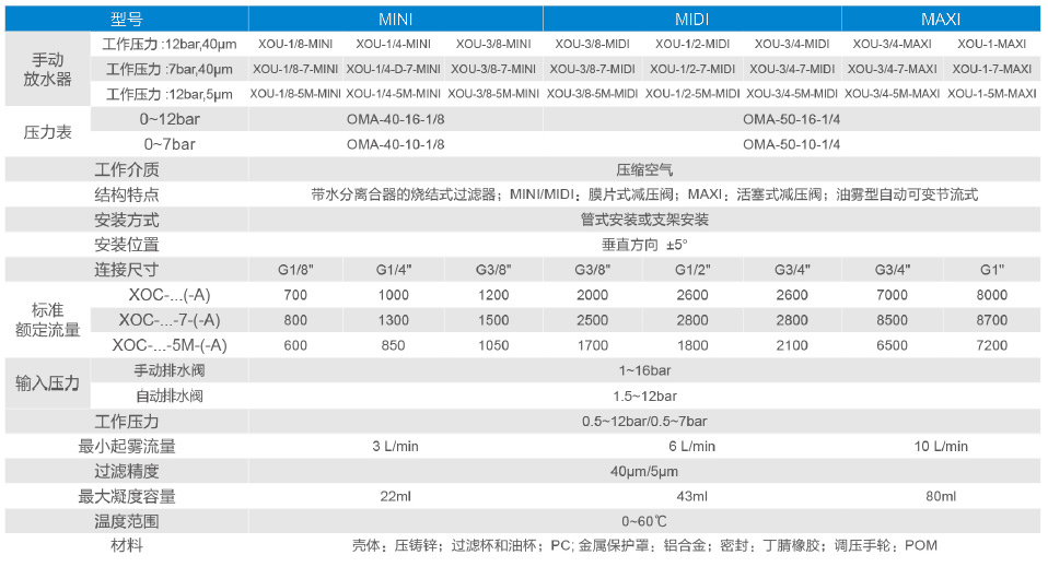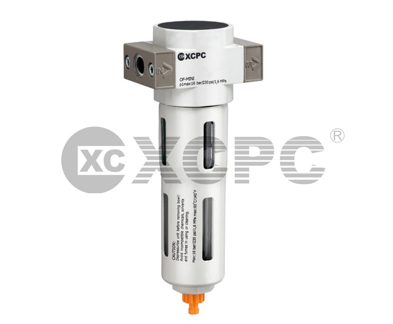 XOC型二聯(lián)件由一個(gè)XOF型過(guò)濾器,-一個(gè)XOR減壓閥和一個(gè)XOL型油霧器組成,這些元件可以分別訂購(gòu),分水過(guò)濾器能過(guò)濾空氣中的液態(tài)油、冷凝水及雜質(zhì),對(duì)于特殊應(yīng)用場(chǎng)合,5μm濾芯容易替換40μm的標(biāo)準(zhǔn)濾芯。即使輸入壓力與壓縮空氣消耗產(chǎn)生系統(tǒng)波動(dòng),減壓閥也能保證其設(shè)定的工作壓力非常穩(wěn)定。