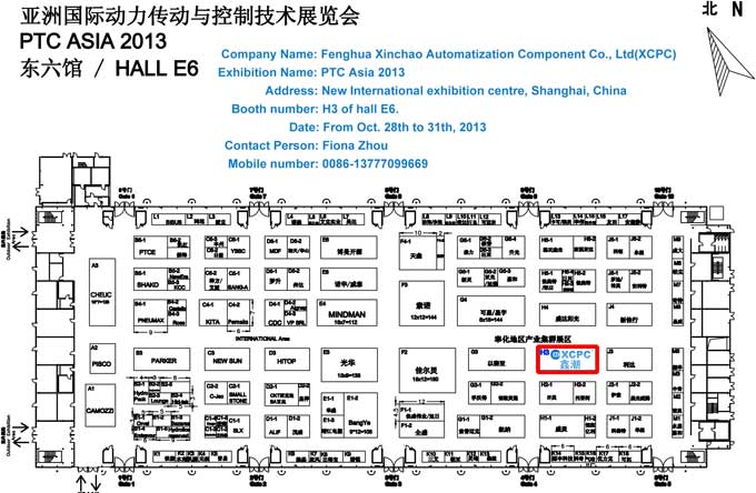 2013年10月28日-31日,鑫潮氣動將在上海新國際博覽中心參加PTC展會,我公司的展位在E6館,H3。歡迎新老客戶到時訪問我們的展位。攤位詳細圖請參考附上的圖片